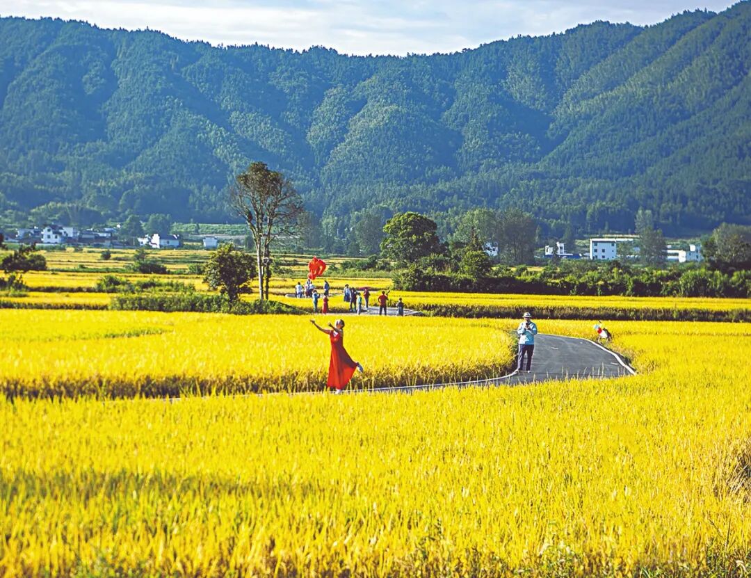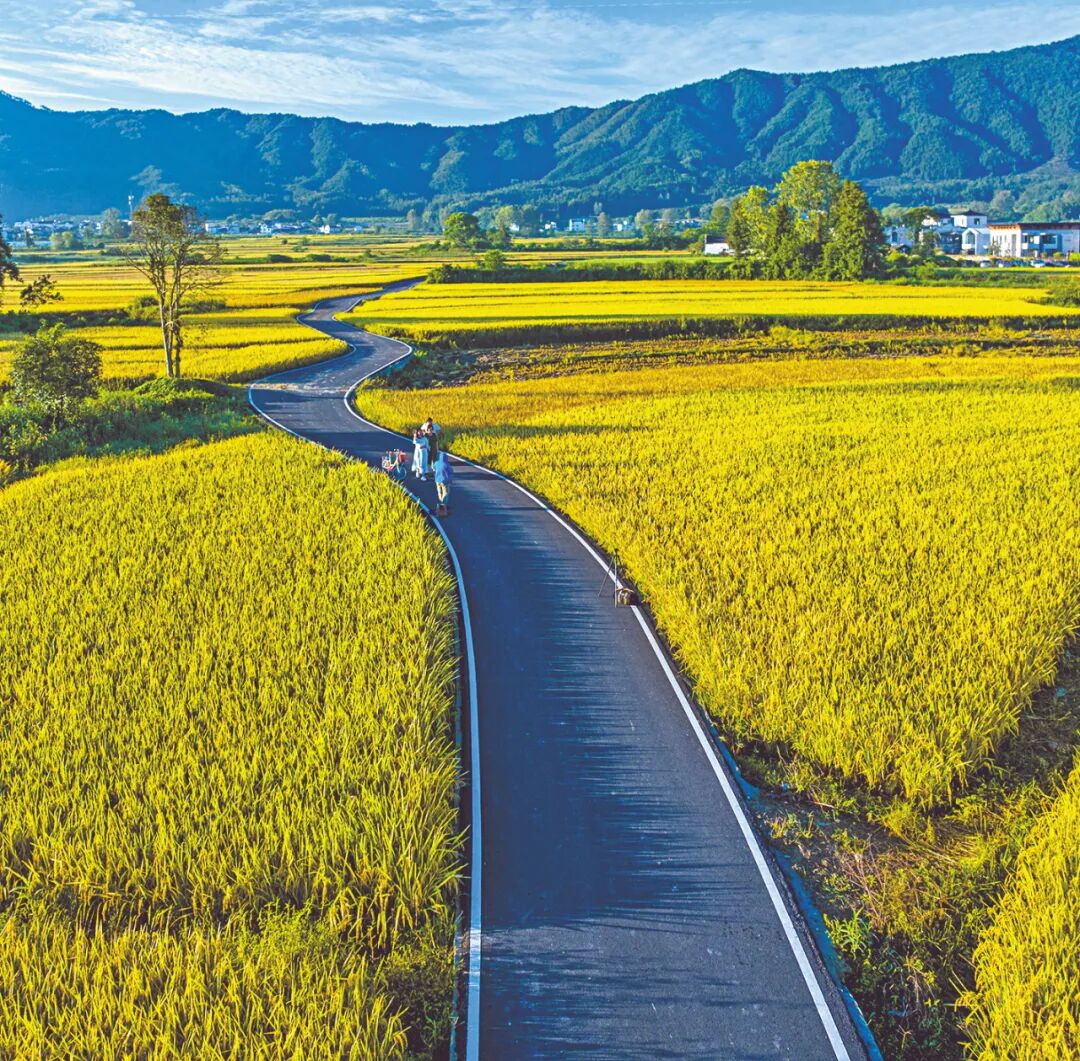 从黟县县城驱车西行15分钟摆布,行将到关麓村时,你会被路左侧一派灿艳的稻田所招引。稻田由北往南,呈路线状缓缓抬升,直至远山至极。其中,一条周折迂回的“S”形弯说念小公路高下转变,盘旋于金色的稻田中,似一条飞动的玄色裙带,好意思到极致。这即是连年来被无边网友热捧的“稻田网红路”。每年秋季丰充时节,关麓村漫无边际的稻田泛起层层海浪,千里甸甸的稻谷逆风摇动,稻浪泄气着旷野的清香,宛如绘在地面上的一幅好意思妙油画。你不错约上三五好友,骑上单车,在曲险阻折的田间柏油路上骑行,在金黄色画卷里呼吸着富氧的清新空气,享受着村庄生计的宁静与舒服。